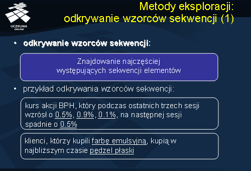 Innym przykładem może być kurs akcji BPH, który podczas ostatnich trzech sesji wzrósł o 0.5%, 0.9%, 0.1%, na następnej sesji spadnie o 0.5%. Również w nawiązaniu do koszyka zakupów, jeżeli do współwystępowania produktów dołożymy element czasowy będziemy mieli do czynienia z problemem odkrywania wzorców sekwencji następującej postaci. „klienci, którzy kupili farbę emulsyjną, kupią w najbliższym czasie pędzel płaski, a jeszcze później rozpuszczalnik’.