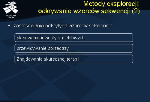 Metoda odkrywania wzorców sekwencji znalazła zastosowanie w wielu dziedzinach: analiza koszyka zakupów, telekomunikacja, medycyna (znajdowanie skutecznej terapii), ubezpieczenia i bankowość, planowanie inwestycji giełdowych, przewidywanie sprzedaży, WWW, itd. W przypadku analizy koszyka zakupów, metodę odkrywania wzorców sekwencji stosuje się w celu znalezienia typowych wzorców zachowań klientów w czasie. Dotyczy to handlu hurtowego lub półhurtowego, gdy potrafimy zidentyfikować pojedynczego klienta i jego koszyk zakupów. W takim przypadku, z każdym rekordem opisującym zakupy pojedynczego klienta jest związana, dodatkowo, informacja o kliencie (identyfikator klienta) i o dacie zakupów (etykieta czasowa rekordu). Na podstawie danych opisujących zakupy danego klienta, uporządkowanych zgodnie z wartościami etykiet czasowych można uzyskać profil klienta i próbować przewidzieć jego zachowanie w czasie.