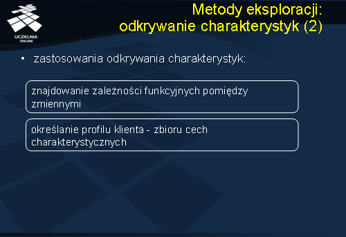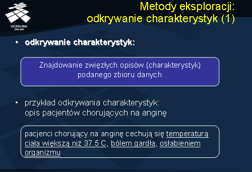 Kolejną metodą eksploracji danych jest odkrywanie charakterystyk. Metoda ta polega na znajdowaniu zwięzłych opisów (charakterystyk) podanego zbioru danych, czy też znajdowaniu zależności funkcyjnych pomiędzy zmiennymi opisującymi zbiór danych. Przykładem wykorzystania odkrywania charakterystyk może być opis pacjentów chorujących na anginę. Celem jest określanie powszechnych symptomów wskazanej choroby, czyli w przypadku anginy możemy podać następującą charakterystykę ‘pacjenci chorujący na anginę cechują się temperaturą ciała większą niż 37.5C, bólem gardła i osłabieniem organizmu’.