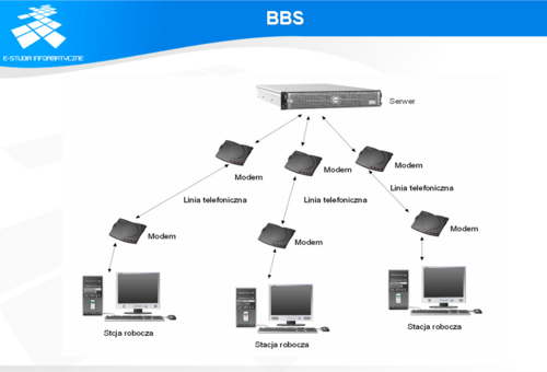 W związku z tym w latach 80tych XXw. opracowano sposób komunikacji typu punkt-punkt oparty na łączności modemowej wykorzystującej standardowe, komutowane łącza klasycznej sieci telefonicznej. Wykorzystując tę metodę stworzono specjalne centra zwane BBS’ami (ang. Bulletin Boards), pełniące rolę punktów kontaktowych, za pomocą których można było wymieniać wiadomości i pliki. Zaletą BBS’ów były: porównywalnie niższy koszt instalacji i utrzymania w stosunku do innych rozwiązań oraz tania metoda dostępu. Należy zaznaczyć, że tani koszt dostępu wynikał stąd, że wiadomości miały jedynie postać tekstową, a rozmiar plików w tamtym czasie był na tyle mały, że nawet szybkości transmisji na poziomie 1200/2400 bps umożliwiały szybki transfer, co oznaczało krótki czas płatnego połączenia komutowanego. Wadą BBS’ów było to, że jednocześnie z BBS’em mogło połączyć się tylu użytkowników ile było zainstalowanych linii telefonicznych oraz to, że każde połączenie wymagało osobnego modemu. Ponadto, należało wiedzieć o istnieniu danego BBS’u oraz znać jego numer. Jeżeli numer był z innej strefy taryfikacyjnej koszt połączenia zdecydowanie wzrastał.