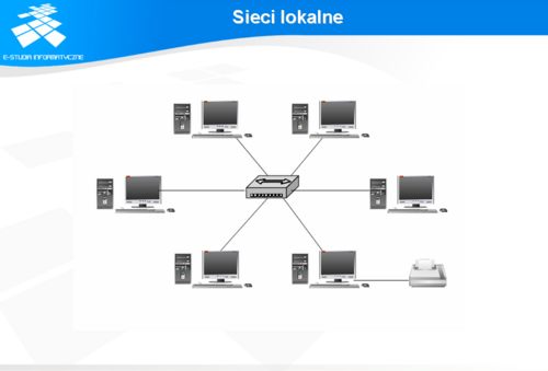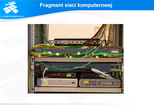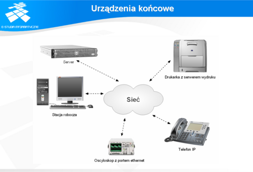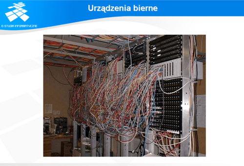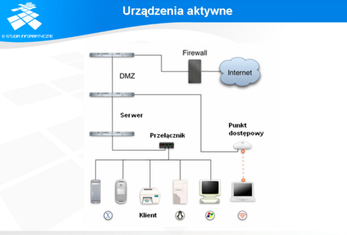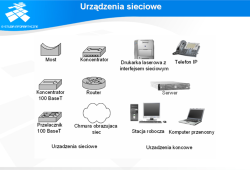 kable koncentratory bierne jak i elementy aktywne: huby mosty przełączniki routery konwertery modemy punkty dostępowe sieci bezprzewodowych oraz urządzenia końcowe: stacje robocze serwery drukarki terminale inne sieciowe urządzenia peryferyjne