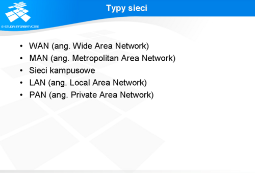 Pierwotnie rozpoznawano dwa typy sieci: sieci rozległe (WAN) łączące uczelnie, ośrodki obliczeniowe i inne placówki naukowo badawcze oraz sieci lokalne (LAN) stosowane do łączenia komputerów w poszczególnych ośrodkach. Wraz z rozrastaniem się sieci uczelnianych pojawił się termin „sieci kampusowe” oznaczający sieć komputerową jednej lub kilku uczelni powstałą w wyniku połączenia ich wewnętrznych sieci lokalnych. Sieci metropolitalne (MAN) charakterystyczne są dla dużych ośrodków miejskich, gdzie znajdują się siedziby wielu uczelni, urzędów oraz firm komercyjnych, a także istnieje specyficzna dla tego środowiska infrastruktura techniczna. Ostatnio powstał jeszcze jeden termin definiujący prywatne sieci komputerowe (PAN). Określenie to dotyczy sieci instalowanych w domach lub w obrębie jednego lub kilku stanowisk pracy znajdujących się w niewielkiej odległości od siebie (do ok. 10m).