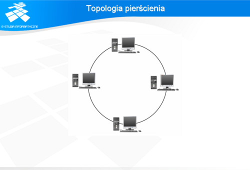 Topologia ta stosowana jest głównie do budowy lokalnych sieci komputerowych. Transmisja w sieci zbudowanej w oparciu o tę topologię polega na przekazywaniu żetonu dostępu. Oprócz tego, każde urządzenie pełni rolę regeneratora sygnału. Podobnie jak w przypadku topologii magistrali zaletą topologii pierścienia jest niska cena wynikająca z małego zużycia kabli i braku aktywnych urządzeń pośredniczących w komunikacji między komputerami. Dodatkowo do budowy sieci w tej topologii można użyć różnych mediów transmisyjnych (kabel koncentryczny, skrętkę, kable światłowodowe). Wadą tej topologii są ograniczenia i utrudnienia związane z rozbudową i konserwacją sieci. Uszkodzenie jednego z urządzeń lub łączy oznacza przerwę w pracy całej sieci.