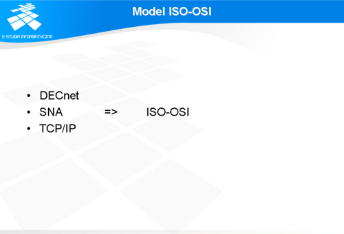 budowa sieci, działanie sieci, zarządzanie siecią. Ze względów praktycznych (stan rozwoju technologii, konkurencja między producentami, preferencje użytkowników, sytuacja polityczna) zaproponowane wraz z modelem ISO/OSI rozwiązania nie przyjęły się, poza samym modelem odniesienia. Weryfikacji rozwiązań dokonał „rynek”. Można zaryzykować stwierdzenie, że momentem decydującym było opracowanie rodziny protokołów TCP/IP, zaimplementowanie ich w sieci ARPANET oraz w systemach UNIX’owych. Z czasem, w celu zachowania jednolitego modelu komunikacji w całym Internecie rodzina protokołów TCP/IP stała się także podstawowym standardem wykorzystywanym w sieciach lokalnych.