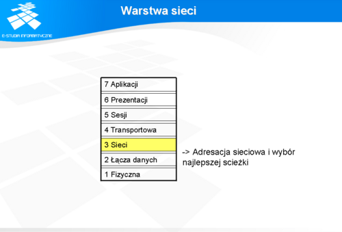 Podstawową jednostką informacji w tej warstwie jest pakiet o ściśle określonej strukturze zawierający oprócz danych, adresy: nadawcy i odbiorcy pakietu. Warstwa ta nie gwarantuje niezawodności transmisji, natomiast wyposażona jest w mechanizmy monitorowania transmisji, co pozwala m.in. na identyfikację przyczyn uniemożliwiających komunikację.