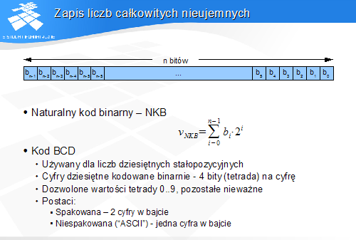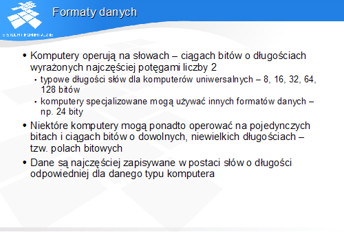 W dalszej części do opisu różnych reprezentacji danych liczbowych będziemy posługiwali się założeniem, że dane reprezentowane są przez słowo komputera, w którym poszczególne bity zostały ponumerowane od prawej do lewej strony.