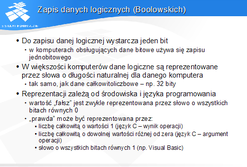 Najprostszy typ danych stanowią dane logiczne. Mogą one przyjmować dwie wartości. Bajtowe adresowanie danych używane w komputerach oraz fakt, że wiele komputerów traktuje jako podstawowy format danych słowo 32-bitowe powodują, że dane logiczne są zwykle zapisywane w postaci bajtów lub słów, pomimo, że do ich zapisu wystarczyłby pojedynczy bit.