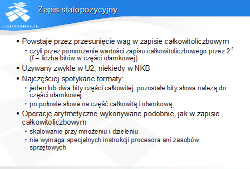 Do zapisu liczb bez znaku używa się jako bazowej postaci NKB, a do zapisu liczb ze znakiem – U2. Komputery zazwyczaj nie obsługują w szczególny sposób zapisów stałopozycyjnych. Podstawowe operacje są wykonywane tak samo, jak na liczbach całkowitych, odmienna jest jedynie interpretacja zapisu, za którą jest odpowiedzialny wyłącznie programista.