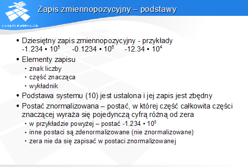 Aby zapisać (przechować) liczbę, musimy zapisać jej znak, część znaczącą oraz wykładnik, który jest liczbą całkowitą ze znakiem.