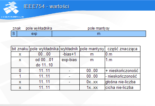 Wartość pola wykładnika złożona z bitów o wartości 1 oznacza tzw. nie-liczby. Pole mantysy równe 0 identyfikuje nieskończoność. Wzorzec bitowy, w którym najbardziej znaczący bit jkest równy 0, a wśród pozostałych jest co najmniej jedna jedynka jest zapisem głośnej nie-liczby, czyli wartości, która ni e może być argumentem operacji. Najbardziej znaczący bit mantysy o wertości 1 identyfikuje cichą nie-liczbę. Wynikiem operacji na cichej nie-liczbie jest zawsze cicha nie-liczba.