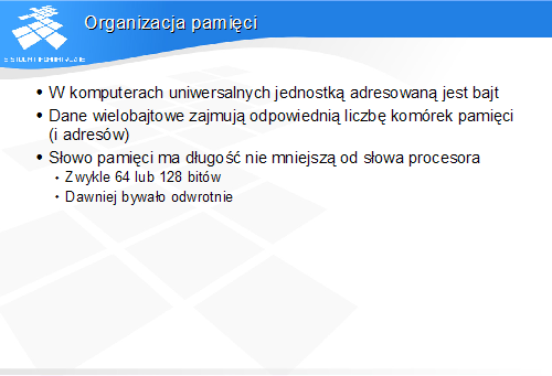 Podstawowa adresowalna komórka pamięci ma rozmiar jednego bajtu. Dane o rozmiarach przekraczających jeden bajt są przechowywane w kilku kolejnych komórkach, pod kilkoma kolejnymi adresami.