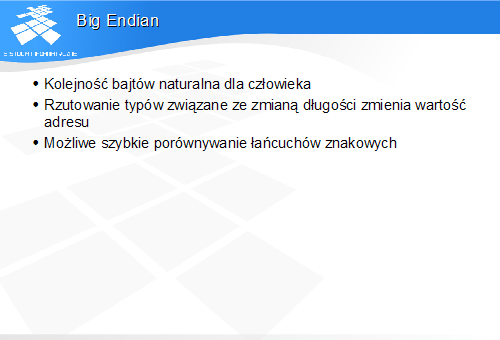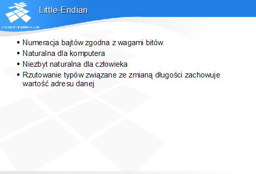 Istotną cechą tej konwencji jest to, że jeżeli zapiszemy w pamięci daną całkowitoliczbową w długim formacie (np. 64 bity), to przy dostępach do jej mniej znaczącej części o mniejszej długości (np. jednego, dwóch lub czterech bajtów) adres danej będzie w każdym przypadku ten sam. Jest to wygodne przy częstym rzutowaniu typów całkowitoliczbowych, ca ma miejsce w programach pisanych w języku C.