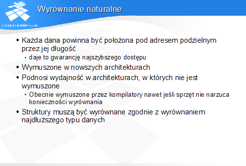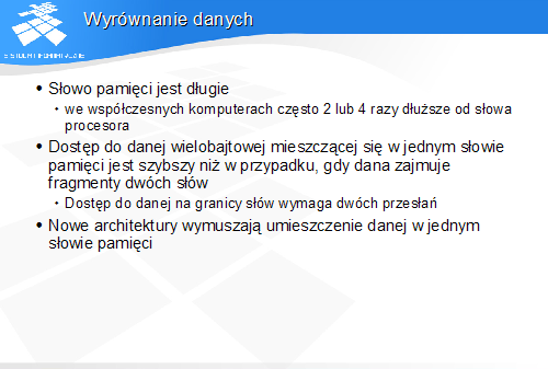 Dane powinny być umieszczone w pamięci w taki sposób, aby dostęp do danej, której rozmiar nie przekracza długości słowa pamięci następował w pojedynczym cyklu dostępu do pamięci.