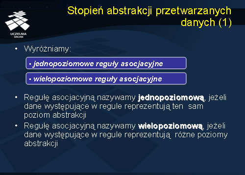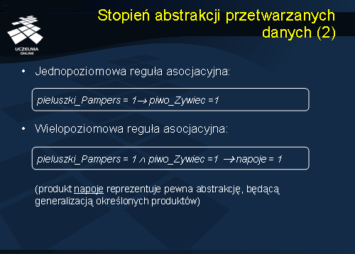 Z punktu widzenia stopnia abstrakcji przetwarzanych danych wyróżniamy dwa rodzaje reguł asocjacyjnych: (1) {jednopoziomowe reguły asocjacyjne} (ang. single-level association rules) oraz (2) {wielopoziomowe} lub {uogólnione reguły asocjacyjne} (ang. multilevel lub generalized association rules). Regułę asocjacyjną nazywamy {jednopoziomową regułą asocjacyjną}, jeżeli dane występujące w regule reprezentują ten sam poziom abstrakcji. Przykładem takich danych są konkretne produkty zakupione w supermarkecie, wykłady, na które zarejestrowali się studenci na studiach, słowa kluczowe występujące w dokumentach tekstowych, itd. Czasami dane występujące w bazie danych tworzą pewną hierarchię poziomów abstrakcji. Przykładowo, produkty w supermarkecie można poklasyfikować według kategorii produktu: produkt 'pieluszki_Pampers' należy do kategorii 'pieluszki', która, z kolei, należy do kategorii 'środki_czystości'; produkt 'piwo_żywiec' należy do kategorii 'piwo', która, z kolei, należy do kategorii ‘napoje_alkoholowe' i, dalej, do kategorii 'napoje'; wreszcie, produkt 'czekolada_milka' należy do kategorii 'słodycze'. Reguły, które opisują asocjacje występujące pomiędzy danymi reprezentującymi różne poziomy abstrakcji, nazywamy {wielopoziomowymi regułami asocjacyjnymi}.