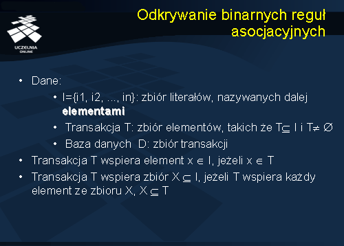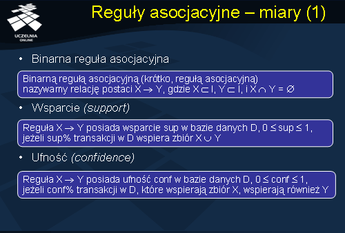 Binarną regułą asocjacyjną nazywamy implikację postaci X -> Y, gdzie X ? I, Y ? I, i X ? Y = ?. Zbiór X nazywamy poprzednikiem reguły (ang. body, antecedent), natomiast zbiór Y następnikiem reguły (ang. head, consequent).