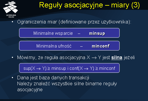 Z każdą binarną regułą asocjacyjną ? ? ?, są związane dwie miary określające statystyczną ważność i siłę