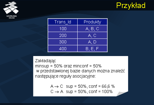 Rozważmy powyższy przykład. Mamy dana tabelę informacji zawierająca identyfikator transakcji oraz produkty jakie w ramach tej transakcji zostały zakupione. Przyjmujemy, że interesują nas tylko reguły z 50% wsparciem minsup = 50% i jednocześnie z co najmniej 50% ufnością minconf=50%. W przedstawionej bazie danych możemy znaleźć następujące reguły asocjacyjne: