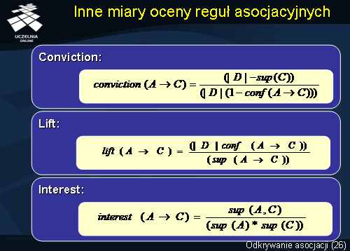 Istnieją jeszcze inne miary określające ocenę otrzymanych reguł asocjacyjnych, np.: Coviction, Lift oraz Interest.