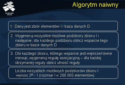 Naiwny algorytm odkrywania zbiorów częstych składa się z trzech głównych kroków.