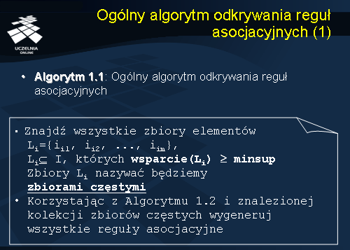 asocjacyjnych: Apriori i AprioriTID. Algorytmy te stały się, w późniejszym czasie, podstawą wielu nowych algorytmów odkrywania binarnych reguł asocjacyjnych. Cechą wspólną wszystkich algorytmów odkrywania silnych binarnych reguł asocjacyjnych jest identyczny ogólny schemat działania algorytmu. Schemat ten, został umieszczony na slajdzie. Schemat został nazwany "ogólnym algorytmem odkrywania silnych binarnych reguł asocjacyjnych"'.
