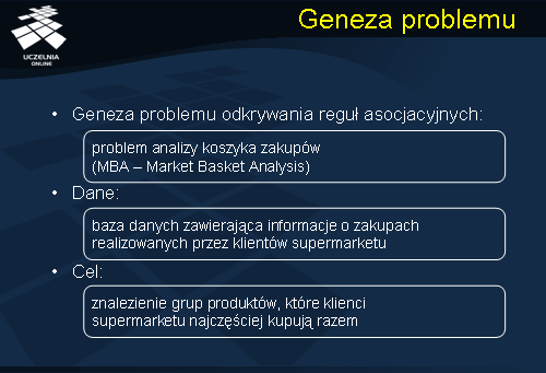Odkrywanie asocjacji jest jedną z najciekawszych i najbardziej popularnych technik eksploracji danych. Celem procesu odkrywania asocjacji jest znalezienie interesujących zależności lub korelacji, nazwanych ogólnie asocjacjami, pomiędzy danymi w dużych zbiorach danych. Wynikiem procesu odkrywania asocjacji jest zbiór reguł asocjacyjnych opisujących znalezione zależności lub korelacje pomiędzy danymi. Geneza problemu odkrywania reguł asocjacyjnych sięga problemu odkrywania asocjacji rozważanego w kontekście tak zwanej analizy koszyka zakupów (MBA - Market Basket Analysis). Klasyczny problem analizy koszyka zakupów polega na analizie danych zawierających informacje o zakupach zrealizowanych przez klientów supermarketu. Celem takiej analizy jest znalezienie naturalnych wzorców zachowań konsumenckich klientów poprzez analizę produktów (grup produktów), najczęściej kupowanych razem przez klientów supermarketu.