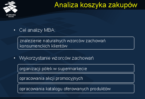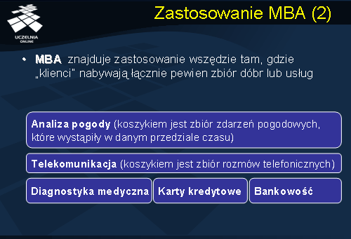 Market Basket Analysis znajduje zastosowanie wszędzie tam, gdzie „klienci” nabywają łącznie pewien zbiór dóbr lub usług: