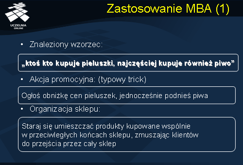„ ktoś kto kupuje pieluszki , najczęściej kupuje również piwo ”. Wiedza, jaką niesie powyższa reguła, może być wykorzystana wielorako, np.: organizując akcję promocyjną można zastosować typowy trick pod hasłem 10% obniżki ceny pieluszek. Naturalną konsekwencją akcji powinno być zwiększenie liczy klientów kupujących pieluszki i tym samym, zrekompensowanie straty wynikającej z oferowanej obniżki ceny pieluszek. Jednakże, dodatkowym źródłem dochodu może być również zwiększony zysk z tytułu dodatkowej sprzedaży piwa kupowanej najczęściej z pieluszkami. Innym przykładem wykorzystania zdobytej wiedzy może być reorganizacja półek sklepowych w taki sposób aby umieścić produkty kupowane wspólnie obok siebie na półkach co może wpłynąć na zwiększenie sprzedaży obu produktów odwołując się do naturalnych preferencji konsumenckich klientów. Można również wykorzystać sytuację odwrotną umieszczając produkty kupowanych wspólnie w przeciwległych końcach sklepu, zmuszając klientów do przejścia przez cały sklep.