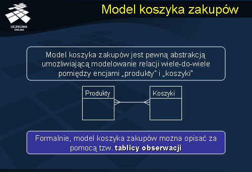 Modelując koszyk zakupów, możemy odnieść się do pewnej abstrakcji umożliwiającej modelowanie relacji wiele-do-wiele pomiędzy wspomnianymi encjami „Produkty” i „Koszyki”. Model koszyka zakupów modelujemy najczęściej w postaci tzw. tablicy obserwacji.