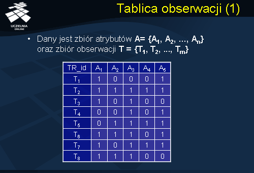 Dany jest zbiór atrybutów A= {A1, A2, ..., An}. Przykładowa tablica obserwacji D dla zbioru atrybutów A, zawierająca 8 obserwacji {T1,…,T8}. Przedstawiona tablica obserwacji dla celów ilustracyjnych, poza zbiorem atrybutów A, zawiera dodatkową kolumnę TR_id, której wartościami są identyfikatory poszczególnych obserwacji. Za pomocą tablicy obserwacji można zamodelować różne przypadki świata rzeczywistego.