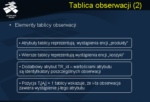 Tablicę obserwacji można wykorzystać również do analizy koszyka zakupów. Zbiór atrybutów tablicy obserwacji odpowiada liście produktów oferowanych przez supermarket, natomiast wiersze tablicy reprezentują klientów i ich koszyki zakupów. Dodatkowy atrybut Tr_id przedstawia identyfikatory poszczególnych obserwacji. Pozycja Ti[Aj] = 1 tablicy wskazuje, że i-ta obserwacja zawiera wystąpienie j-tego atrybutu.