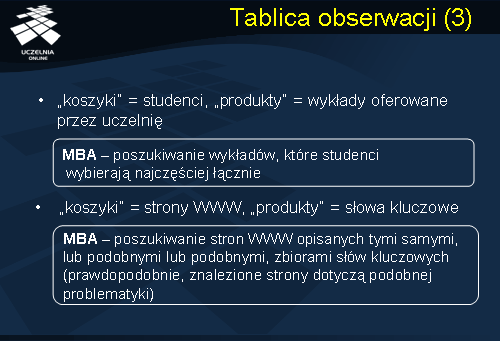 Tablica obserwacji może posłużyć na przykład, do opisu wyboru przedmiotów obieralnych przez studentów. W takim przypadku zbiór atrybutów będzie odpowiadał liście przedmiotów obieralnych oferowanych studentom przez uczelnię, natomiast wiersze tablicy obserwacji będą reprezentowały studentów i ich wybory przedmiotów. Weźmy pod uwagę inny przykład, w którym koszykiem będą strony WWW natomiast produktami – słowa kluczowe, dla takiej reprezentacji możemy sformułować problem MBA jako poszukiwanie stron WWW opisanych takimi samymi, lub podobnymi, zbiorami słów kluczowych. Możemy przypuszczać iż prawdopodobnie znalezione strony będą dotyczyły podobnej tematyki.