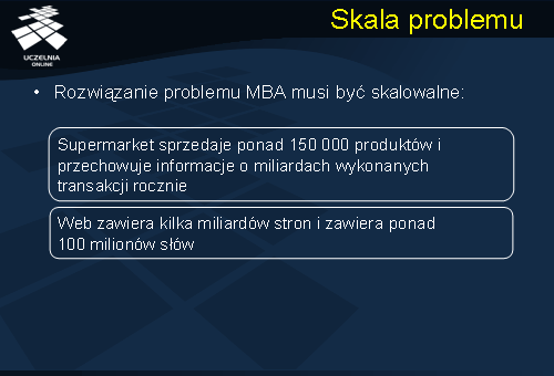 Analizując problem MBA, podając jego rozwiązanie musimy pamiętać o jego skalowalności. Dane, które podane są analizie często osiągają olbrzymie rozmiary. Np. supermarket sprzedaj ponad 150 000 produktów i przechowuje informacje o miliardach wykonanych transakcji rocznie, albo biorąc pod uwagę Web gdzie mamy do czynienia z kilkoma miliardami stron zawierającymi ponad 100 milionów słów.