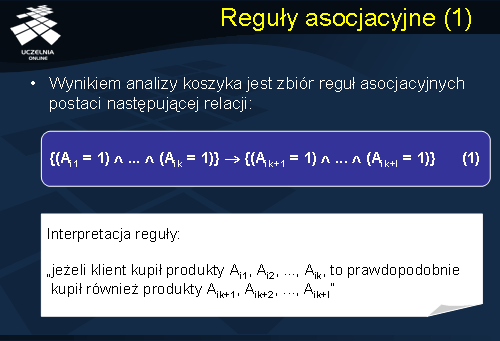 Wynik analizy koszyka zakupów przedstawiany jest w formie zbioru reguł asocjacyjnych postaci relacji przedstawionej na powyższym slajdzie oznaczonej (1). Taką regułę można interpretować w następujący sposób: „jeżeli klient kupił produkty Ai1, Ai2, ..., Aik, to prawdopodobnie kupił również produkty Aik+1, Aik+2, ..., Aik+l”.