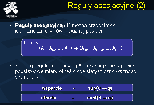 Regułę asocjacyjna można przedstawić jednoznacznie w równoważnej postaci ? ? ?: (Ai1, Ai2, ..., Aik) ? (Aik+1, Aik+2, ..., Aik+l).