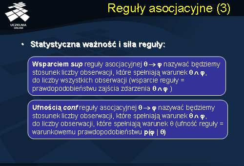 {Wsparciem} (sup) reguły asocjacyjnej ? ? ? nazywać będziemy stosunek liczby obserwacji, które spełniają warunek ? ? ?, do liczby wszystkich obserwacji, przy czym wsparcie reguły jest równe prawdopodobieństwu zajścia zdarzenia ? ? ?.