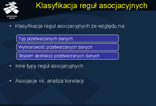 W dalszej części wykładu, krótko scharakteryzujemy poszczególne kryteria klasyfikacji i przedstawimy rodzaje reguł asocjacyjnych wynikające z tych klasyfikacji.