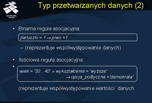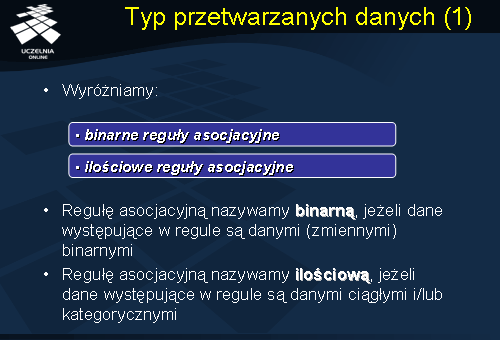 Z punktu widzenia typu przetwarzanych danych wyróżniamy dwa rodzaje reguł asocjacyjnych: (1) {binarne reguły asocjacyjne} (ang. binary lub Boolean association rules) oraz (2) {ilościowe reguły asocjacyjne} (ang. quantitative association rules). Regułę asocjacyjną nazywamy {binarną regułą asocjacyjną}, jeżeli dane występujące w regule są danymi (zmiennymi) binarnymi, to znaczy, danymi, które mogą przyjmować tylko dwie wartości: '1' ({true}) lub '0' ({false}). Regułę asocjacyjną nazywamy {ilościową regułą asocjacyjną}, jeżeli dane występujące w regule są danymi ciągłymi i\lub kategorycznymi. Ilościowe reguły asocjacyjne reprezentują, najogólniej mówiąc, współwystępowanie wartości niektórych danych.