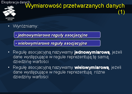 Z punktu widzenia wymiarowości przetwarzanych danych wyróżniamy dwa rodzaje reguł asocjacyjnych: (1) {jednowymiarowe reguły asocjacyjne} (ang. single-dimensional association rules) oraz (2) {wielowymiarowe reguły asocjacyjne} (ang. multidimensional association rules). Regułę asocjacyjną nazywamy {jednowymiarową regułą asocjacyjną}, jeżeli dane występujące w regule reprezentują tę samą dziedzinę wartości. Regułę asocjacyjną nazywamy {wielowymiarową regułą asocjacyjną}, jeżeli dane występujące w regule reprezentują różne dziedziny wartości. Pojęcie {wymiaru} wywodzi się z terminologii magazynów danych, gdzie pojawia się w kontekście pojęcia {analiza wielowymiarowa danych}.