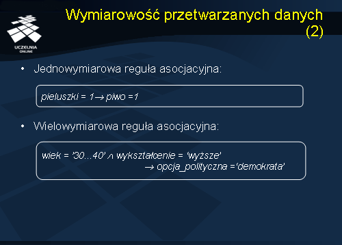 ? wykształcenie = ‘wyższe’ -> opcja_polityczna = ‘demokrata’ ” - jest wielowymiarową regułą asocjacyjną, gdyż występują w niej trzy wymiary: {wiek}, {wykształcenie}, oraz {opcja_polityczna}. Każdy z wymiarów jest reprezentowany jako osobny predykat reguły.