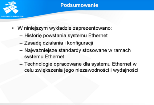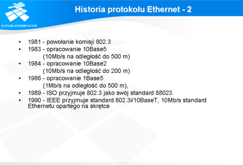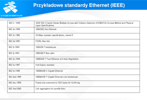 W następnych latach opracowano całą gamę standardów 802.3 uwzględniających bieżący stan rozwoju technologii w zakresie przesyłania sygnałów. Do najważniejszych można zaliczyć standardy o znaczeniu przełomowym dla sieci komputerowych, jak np. wprowadzenie skrętki, czy kolejnych szybkości ethernetu: 100Mb, 1Gb i obecnie 10Gb. Wybrane standardy zostały zamieszczone w tabeli (slajd 10)