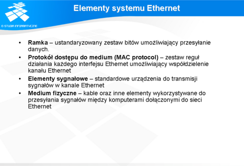 W celu poprawnej realizacji tego zadania muszą zostać spełnione ściśle określone warunki, które definiują cztery podstawowe elementy : ramkę, protokół sterujący dostępem do medium, komponenty sygnalizacji, media fizyczne. Elementy te zostaną opisane w dalszej części rozdziału.