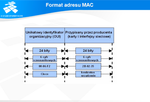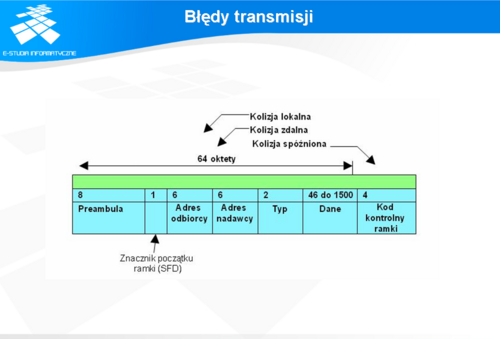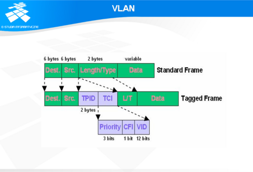 Znacznik początku ramki (SFD) to jeden oktet bitów w postaci: 10101011, oznaczający koniec sekwencji synchronizującej. Pole adresata zawiera MAC adres odbiorcy. Adres odbiorcy może być MAC adresem konkretnego urządzenia, adresem grupowym lub rozgłoszeniowym. Pole adresu nadawcy zawiera MAC adres nadawcy. Adres nadawcy jest MAC adresem konkretnego urządznia nadającego, będącego węzłem sieci Ethernet. Znacznik VLAN (Virtual LAN) został wprowadzony przez standard IEEE 802.1Q. Stanowi on czterooktetowy zespół dodatkowych pól w nagłówku ramki Ethernet służących do identyfikacji przynależności ramki do konkretnego VLAN’u w komunikacji miedzy urządzeniami oraz do obsługi priorytetów zgodnie z QoS (Quality of Service). W skład znacznika wchodzą następujące pola: TPID (Tag Protocol Identifier), TCI (Tag Control Information): Priority, CFI (Canonical Format Indicator ), VID (VLAN ID). TPID – zajmuje miejsce przeznaczone w podstawowym standardzie dla pola typ/długość i jego wartość ustawiona jest na 0x8100, co jednoznacznie identyfikuje typ ramki jako IEEE 802.1Q/802.1P. Priority – trzy pierwsze bity pola TCI pozwalają na zdefiniowanie 8 poziomowego priorytetu zgodnie z IEEE 802.1P. CFI – pole używane do zachowania kompatybilności między przełącznikami Ethernet a Token Ring. Dla przełączników Ethernet wartość tego pola ustawiana jest na 0. VID – Numer identyfikujący VLAN zgodnie z IEEE 802.1Q. Numery VLAN’ów mogą przyjmować wartości od 1 do 4094. Wartość 0 oznacza ramkę priorytetową, wartość 4095 jest zarezerwowana. W standardzie DIX pole to oznaczało typ protokołu warstwy wyższej, natomiast w pierwszej wersji standardu IEEE długość ramki. W celu zapewnienia jednoznacznej interpretacji tego pola, w kolejnym wydaniu standardu IEEE wprowadzono interpretację kontekstową. Jeżeli wartość pola jest mniejsza niż 1536 (0x0600), to wartość określa długość ramki, a identyfikację protokołu warstwy wyższej zapewnia warstwa LLC. W przeciwnym wypadku wartość pola należy interpretować jako numer protokołu warstwy wyższej. Maksymalny rozmiar pola danych wynosi 1500 oktetów, co stanowi wartość maksymalnej jednostki transmisji (MTU – Maximum Transmision Unit) dla sieci Ethernet. Jeżeli całkowita długość ramki jest mniejsza niż 64 oktety, to zawartość pola danych uzupełniana jest dodatkowymi oktetami aż do osiągniecia przez ramkę minimalnej długości. Pole FCS (Frame Check Sequence) zawiera czterobajtową wartość CRC (Cyclic Redundancy Check) tworzoną przez urządzenie nadawcze. Wartość ta jest ponownie przeliczana przez urządzenie odbiorcze. Jeżeli wartość obliczona przez urządzenie odbiorcze jest inna niż wartość znajdująca się w ramce, ramka traktowana jest jako uszkodzona i zostaje pominięta w dalszym przetwarzaniu.