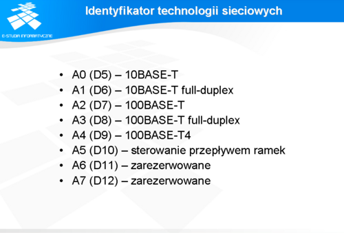 Mechanizm automatycznej negocjacji szybkości parametrów łącza bazuje na sygnalizacji typu FLP (Fast Link Pulse). Sygnalizacja ta stanowi zmodyfikowaną postać sygnalizacji NLP (Normal Link Pulse) używanej w standardzie 10BASE-T do sprawdzania integralności łącza. Standard 10BASE-T wymaga, aby każde urządzenie wysyłało co ok. 16ms ciąg impulsów. Protokół auto-negocjacji zaadoptował ten mechanizm do ogłaszania pełnej funkcjonalności danego interfejsu. W tym celu wysyłane jest tyle 16-bitowych wiadomości ile potrzeba do opisania możliwości interfejsu. Slajd pokazuje strukturę pierwszej wiadomości.