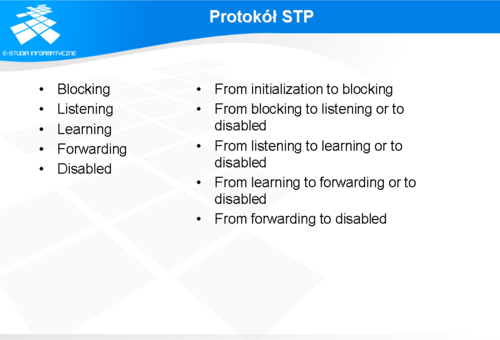 Działanie tego protokołu polega na wzajemnym informowaniu się urządzeń o bieżącym stanie połączeń za pomocą komunikatów BPDU (Bridge Protocol Data Units). W wyniku wymiany informacji nt. konfiguracji połączeń każdy port przełącznika może znajdować się w pięciu różnych stanach i w zależności od sytuacji zmieniać według schematu pokazanego na slajdzie.