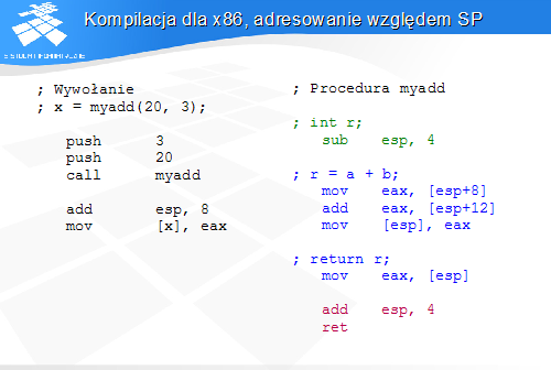 Adresowani względem SP nie nastręcza problemów w procedurach nie wywołujących innych procedur, czyli tzw. liściach.