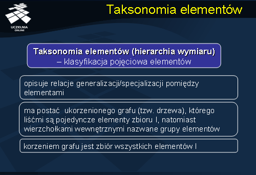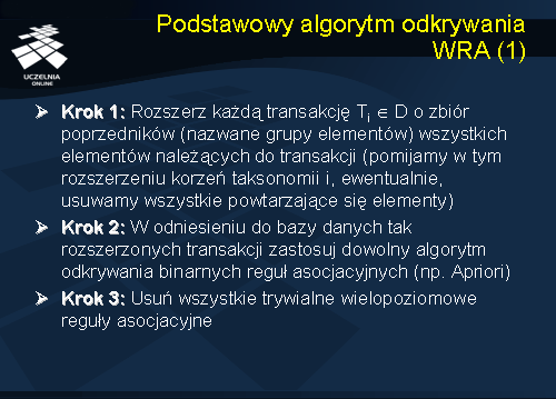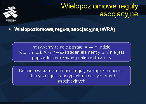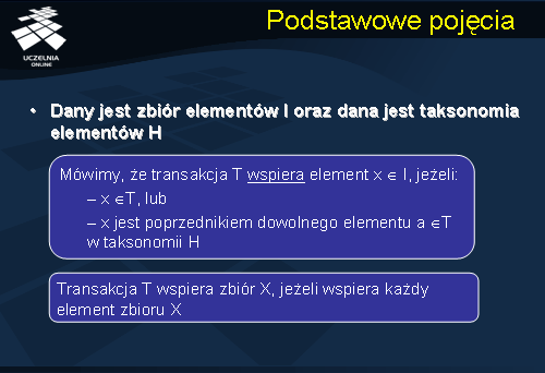 Zanim przedstawimy palgorytm odkrywania wielopoziomowych reguł asocjacyjnych wprowadzimy kilka podstawowych pojęć. Dany jest zbiór elementów I = {l1, l2, ..., lm} oraz taksonomia H elementów zbioru I. Taksonomia H jest ukorzenionym grafem acyklicznym, którego liście reprezentują elementy zbioru I, wierzchołki wewnętrzne reprezentują nazwane podzbiory zbioru I, natomiast łuki reprezentują relację zawierania się. Dowolny, nie pusty, podzbiór T zbioru I, nazywamy transakcją elementów lub, krótko, transakacją.