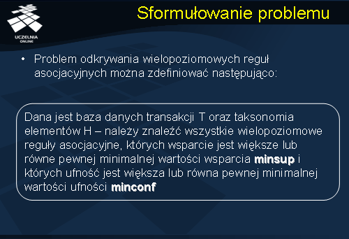 Problem odkrywania wielopoziomowych reguł asocjacyjnych można zdefiniować następująco: dana jest baza danych transakcji T oraz taksonomia elementów H - należy znaleźć wszystkie wielopoziomowe reguły asocjacyjne, których wsparcie s jest większe lub równe pewnej minimalnej wartości wsparcia minsup, i których ufność c jest większa lub równa pewnej minimalnej wartości ufności minconf. Powyższe zdefiniowanie problemu odkrywania wielopoziomowych reguł asocjacyjnych zakłada, że próg minimalnego wsparcia jest jednakowy dla wszystkich reguł niezależnie od tego, czy reguła opisuje asocjacje występujące na najniższym poziomie abstrakcji, to jest, asocjacje pomiędzy elementami zbioru I, czy też na wyższym poziomie abstrakcji, to jest, pomiędzy nazwanymi grupami elementów.