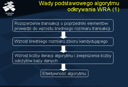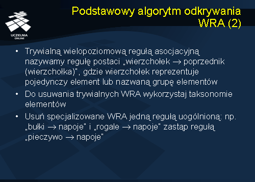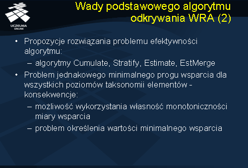 Przedstawione podejście do odkrywania wielopoziomowych reguł asocjacyjnych nastręcza jeszcze jeden istotny problem. Zauważmy, że przedstawione w powyższym algorytmie odkrywania wielopoziomowych reguł asocjacyjnych podejście zakłada jednakowy próg minimalnego wsparcia dla wszystkich poziomów abstrakcji taksonomii elementów. Identyczny próg minimalnego wsparcia odnosi się do nazwanej grupy elementów "napoje"' jak i pojedynczego elementu "orzeszki ziemne firmy Felix w opakowaniu 50-gramowym"'. Ma to swoje istotne zalety. Po pierwsze, użytkownik podaje tylko jedną wartość minimalnego wsparcia i minimalnej ufności. Po drugie, upraszcza i optymalizuje procedurę znajdowania zbiorów częstych. Zauważmy bowiem, że dowolny wierzchołek wewnętrzny taksonomii jest nadzbiorem swoich następników - w fazie znajdowania zbiorów częstych można pominąć analizę zbiorów zawierających elementy, których poprzedniki w taksonomii elementów nie są zbiorami częstymi (algorytm Stratify).