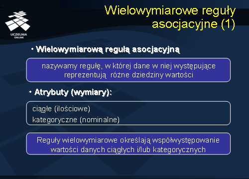 Wielowymiarową regułą asocjacyjną nazywamy regułę, w której dane w niej występujące reprezentują różne dziedziny wartości. Atrybuty (wymiary) mogą być dwojakiego rodzaju ciągłe (ilościowe) lub kategoryczne (nominalne). Reguły wielowymiarowe określają współwystępowanie wartości danych ciągłych i/lub kategorycznych.