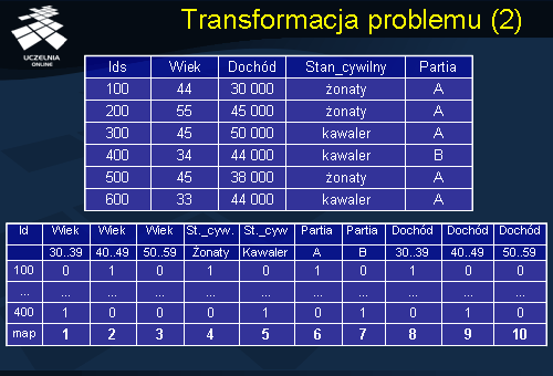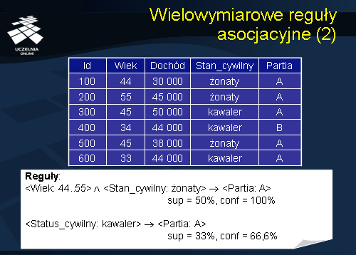 Dla zilustrowania wielowymiarowych reguł asocjacyjnych rozważmy przykład umieszczony na slajdzie. Dana jest baza danych sondażowych przedstawiających wyniki głosowania określonych osób, o określonych parametrach i określonej partii politycznej. Przykładowo osoba o identyfikatorze 100, lat 44, dochodzie 30 000, stan cywilny żonaty – głosował na partię A. W prezentowanej bazie danych można przedstawić następujące otrzymane reguły wielowymiarowe postaci: